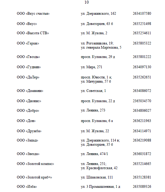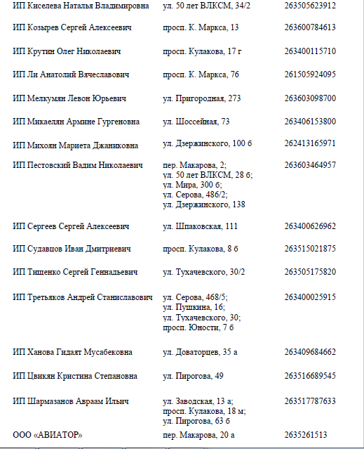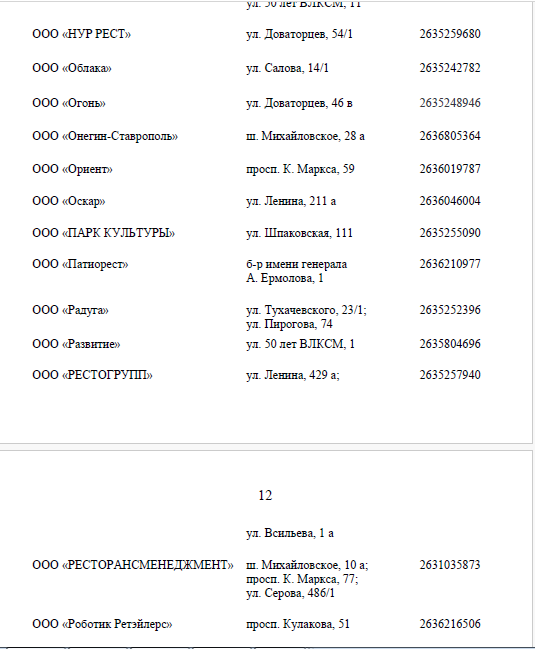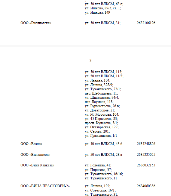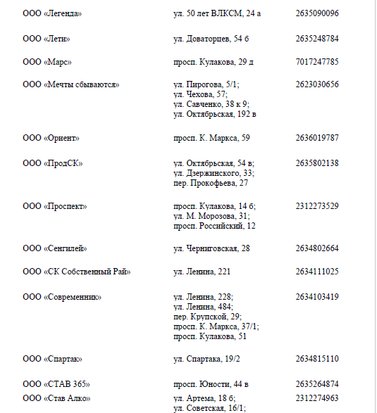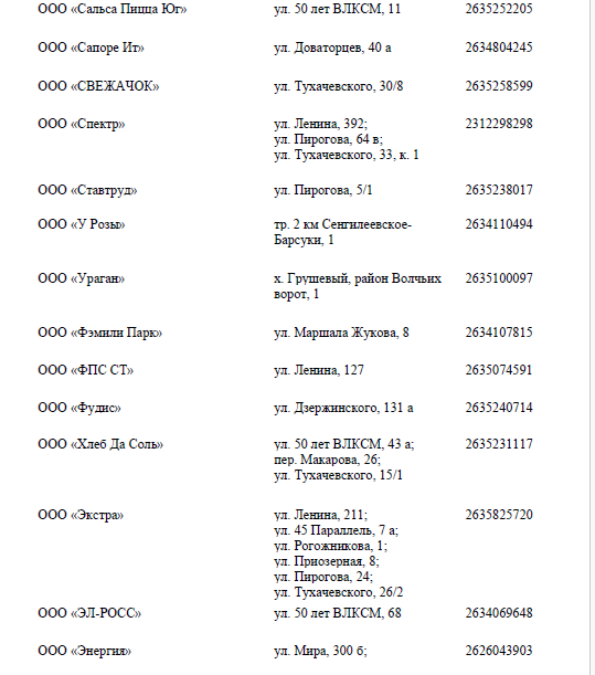 В частности, речь идет о тех же дискобарах «Крыжополь», « Сухой закон», кальяном баре «Золотой гусь», ресторане «Бариха», «Пивотеках» и прочих досуговых местах для взрослых. Потребовать паспорт у молодых людей должны, если они зайдут и в ООО «Алкомаркет плюс», «АС26», «АТС ТРЕЙД», «Бар Сервис», ООО «Библиотека № 1», ООО «Библиотека», «Вилкинсон», «Вина Кавказа», «ВИНА ПРАСКОВЕИ-2», «Виноград». Как и указать на дверь лицам до 18 лет должны в ООО «Торговый дом», «Троя», «Хмельной гастроном», «Южный крест», «Сенгилей», «Современник» «Став Алко» и иных учреждениях.