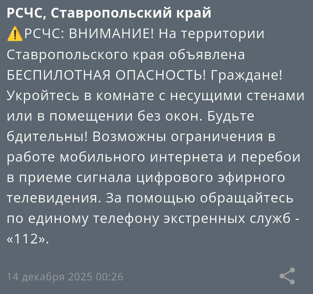 В Ставропольском крае вновь объявлена беспилотная опасность. О возможном прилете дронов 14 декабря предупредили в РСЧС.