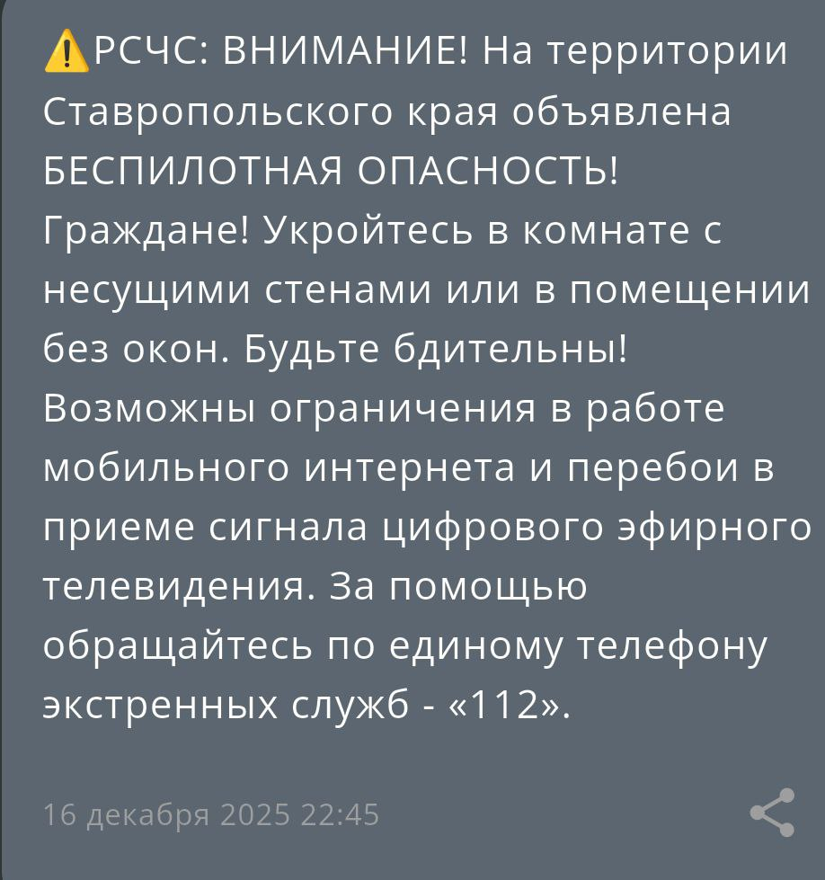 В Ставропольском крае вновь объявлена беспилотная опасность. О возможном прилете дронов 16 декабря предупредили в РСЧС.