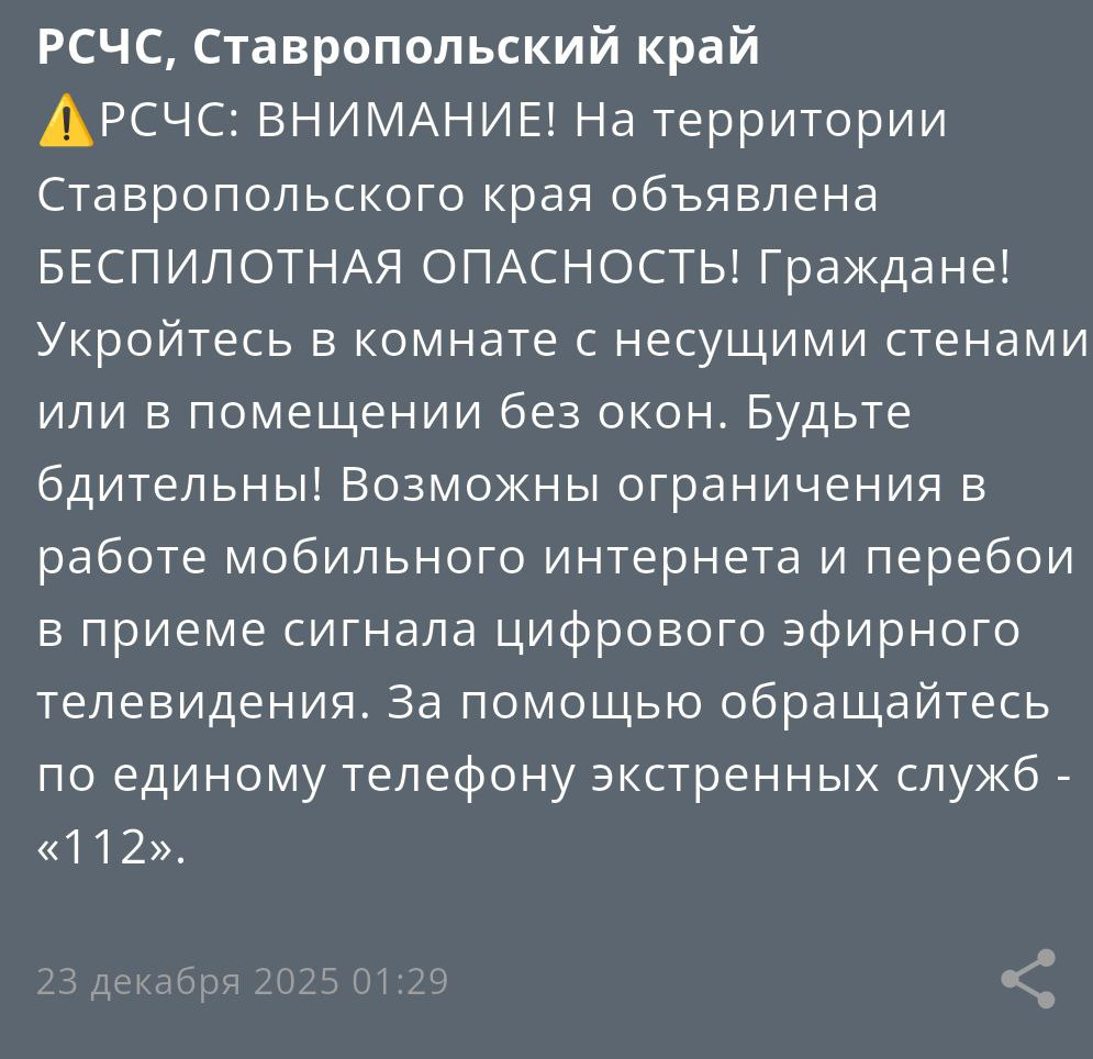 В Ставропольском крае вновь объявлена беспилотная опасность. О возможном прилете дронов 23 декабря предупредили в РСЧС.