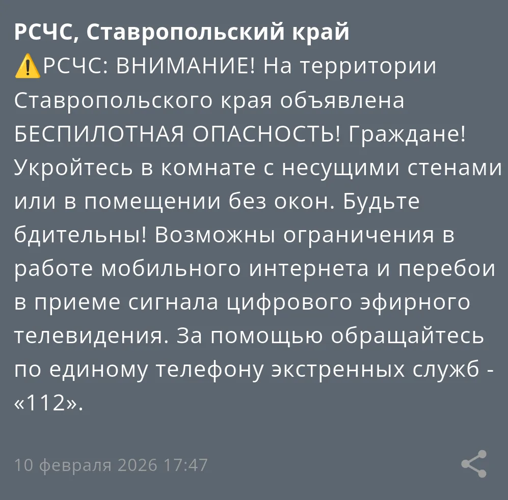 Беспилотную опасность объявили на Ставрополье днем 10 февраля