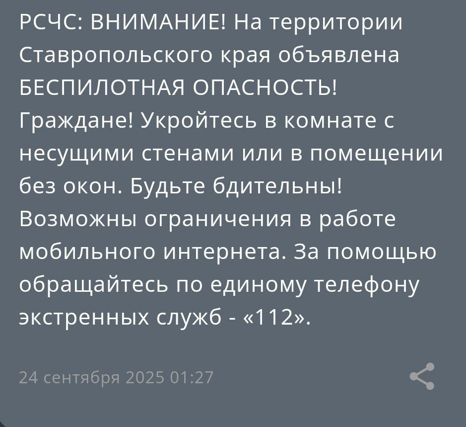 Беспилотную опасность объявили на Ставрополье ночью 24 сентября