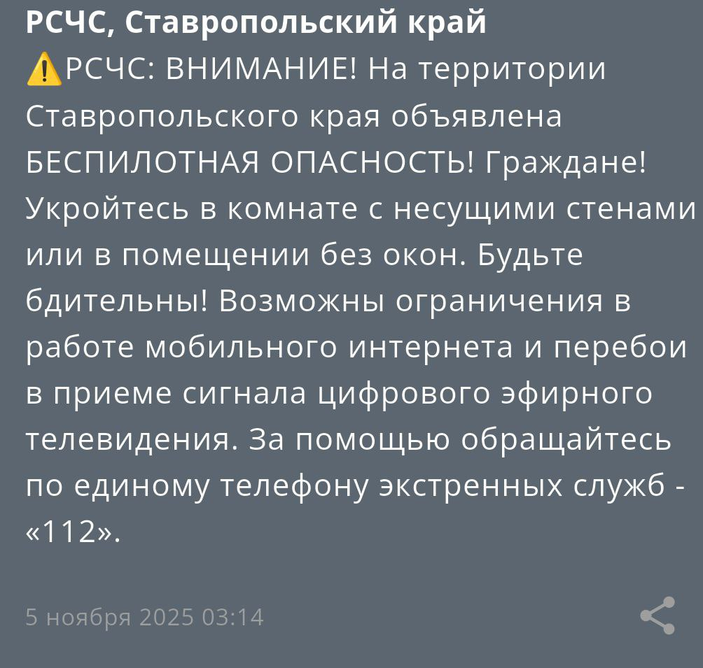 Беспилотную опасность объявили на Ставрополье ночью 5 ноября