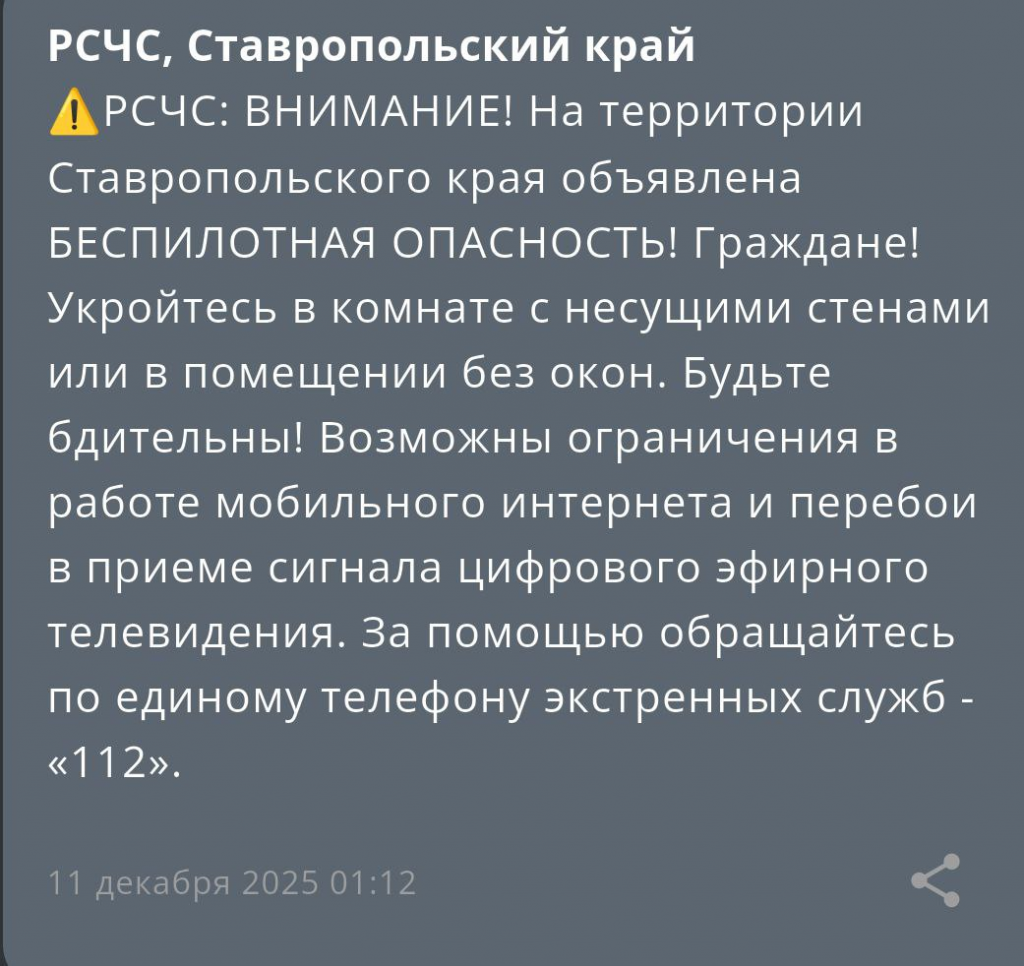 UPD: В 5:40 11 декабря на Ставрополье сообщили об отбое угрозы атаки БПЛА в регионе.
