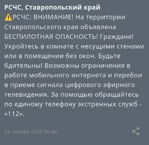 Беспилотную опасность объявили на Ставрополье утром 23 ноября