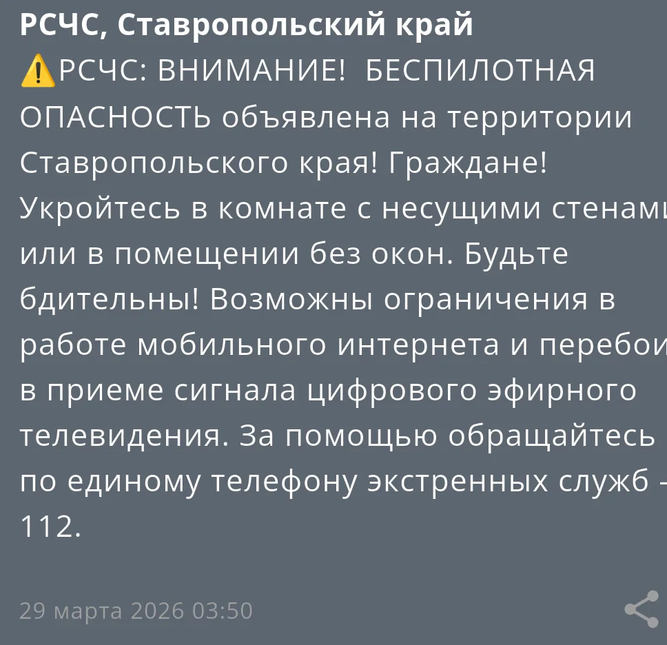 На момент публикации информации о прилетах БПЛА на территории Ставрополья не поступало. Режим был объявлен в 3:50 по московскому времени.