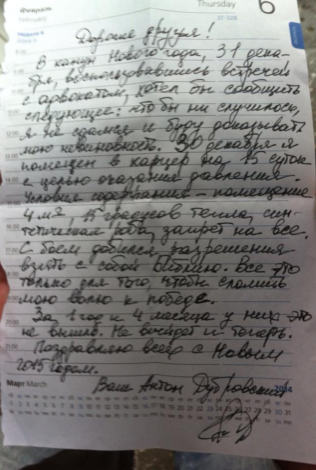 Перед этим Антон Дубровский успел написать письмо на волю и поздравить всех с праздниками.