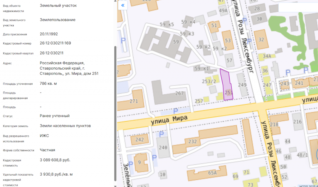Речь идет о земельном участке с кадастровым номером 26:12:030211:169, расположенном по адресу: Ставрополь, улица Мира, 251. Его площадь составляет 786 квадратных метров. Ранее эта территория относилась к зоне застройки среднеэтажными жилыми домами.