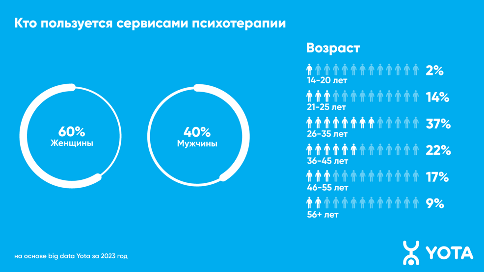 Психологическими сервисами чаще пользуются женщины, они составляют 60% аудитории и обеспечивают 63% интернет-трафика этих ресурсов. Наибольший интерес к онлайн-психологии проявляет аудитория 25-35 лет (37% от всех пользователей). На втором месте — абоненты от 36 до 45 лет (22%), а замыкает топ-3 группа 46-55 лет (17%).