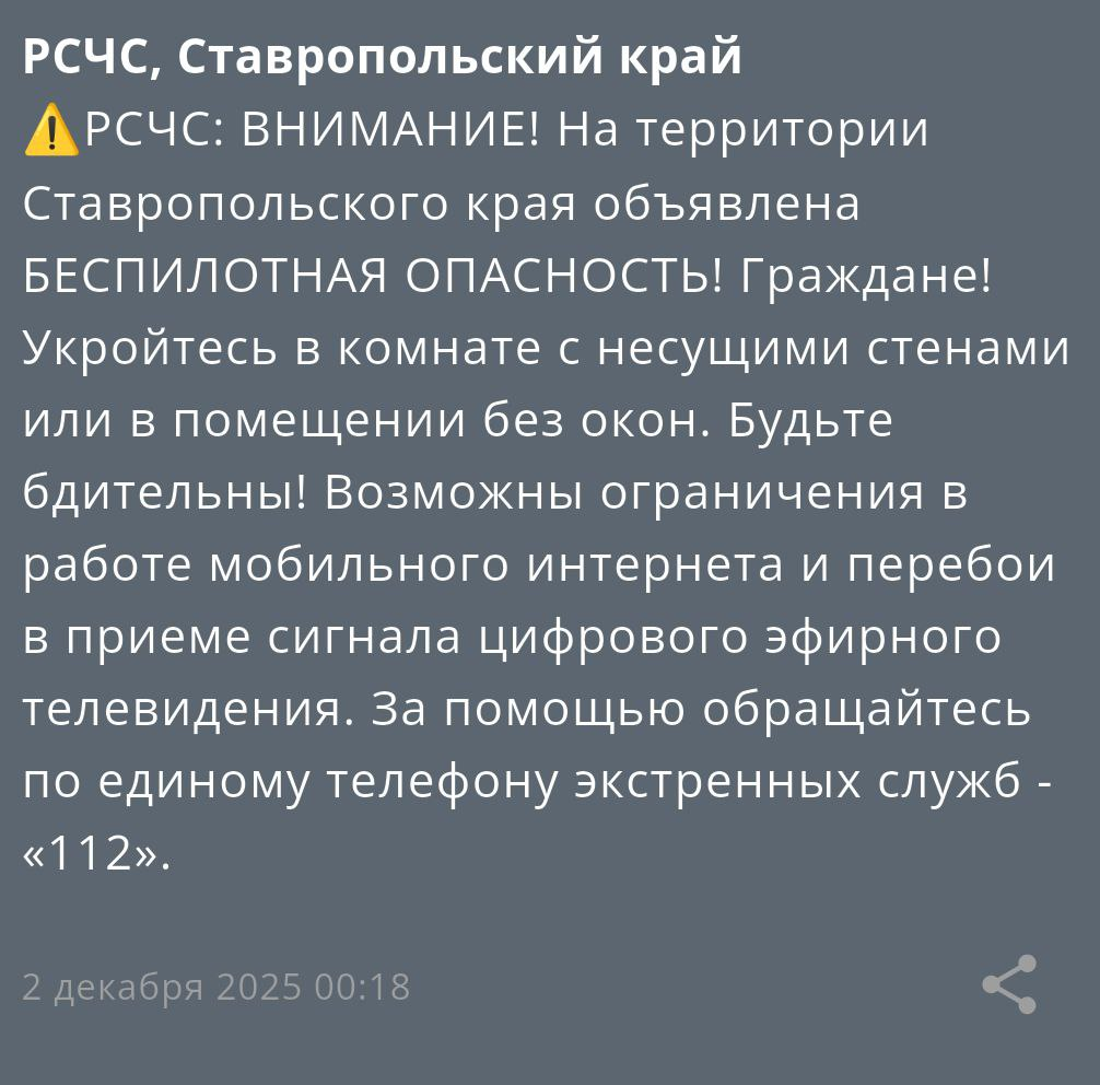 В ночь с 1 на 2 декабря на телефоны ставропольцев вновь стали приходить уведомления о беспилотной опасности. Этими данными поделились в РСЧС в 0:18.