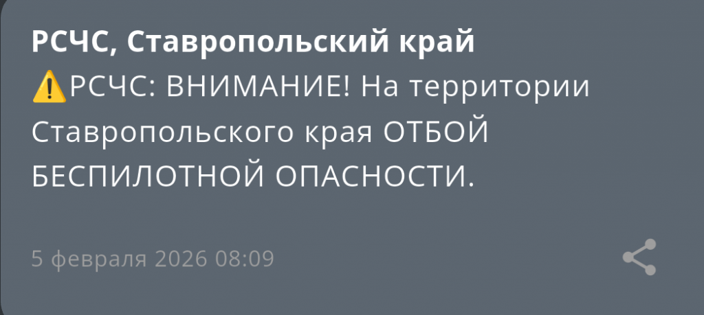 - Беспилотную опасность объявили в Ставропольском крае вечером 4 февраля 2026 года (04.02.2026 19:41)