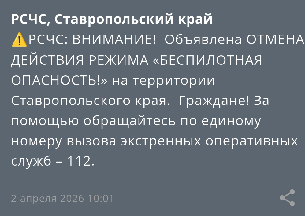 - Сообщение об опасности БПЛА начали получать ставропольцы утром 2 апреля (сегодня, 08:51)
