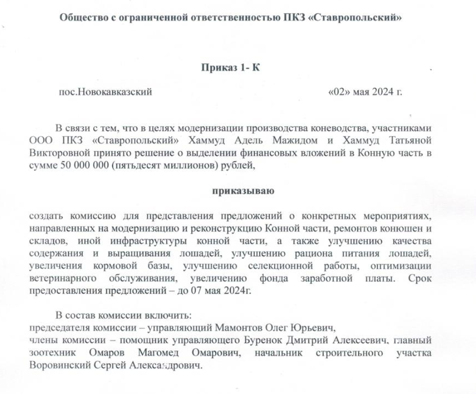 Сотрудники предприятия отметили, что в год на содержание и питание скакунов уходит около 20 миллионов рублей. При этом дополнительные 50 миллионов назначены именно на строительство — корм для животных приобретается стабильно и ежегодно на выделяемые по плану средства.