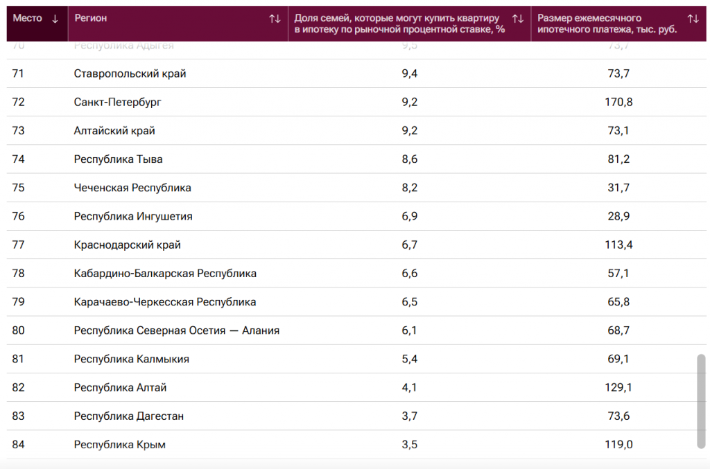 Самым «недоступным» в этом плане по стране является Севастополь, тут ипотеку могут позволить 3,3% семей, а размер ежемесячного платежа один из самых больших по стране — 132,1 тысячи.