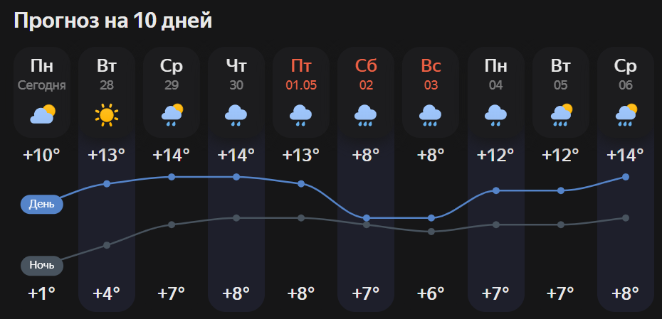 Согласно прогнозу на ближайшие 10 дней, только 28 апреля будет солнечным, потом же снова будут затяжные дожди. Начиная со среды солнце будет появляться реже, скрываясь за тучами. Но 29 апреля осадки продлятся всего полдня, а вот начиная с 1 мая дождь, кажется, до середины понедельника вообще не планирует заканчиваться.