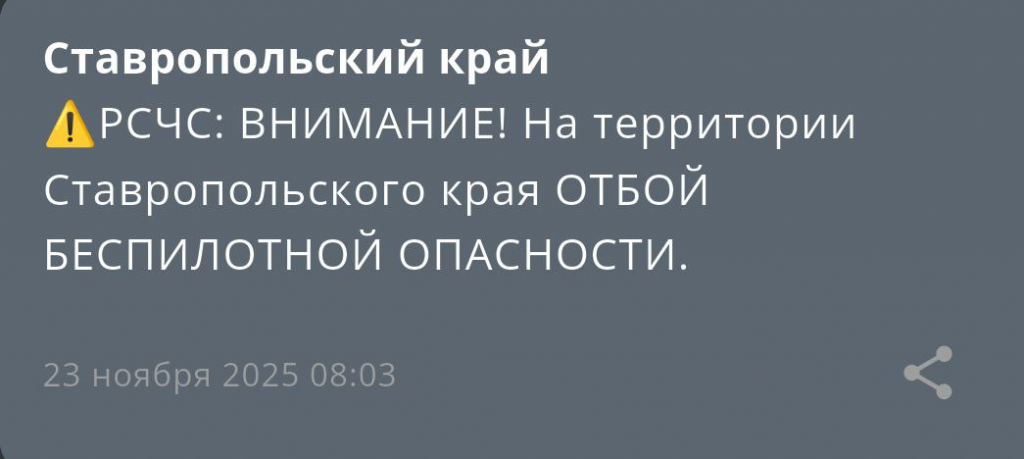 - Беспилотную опасность объявили на Ставрополье утром 23 ноября (23.11.2025 06:59)