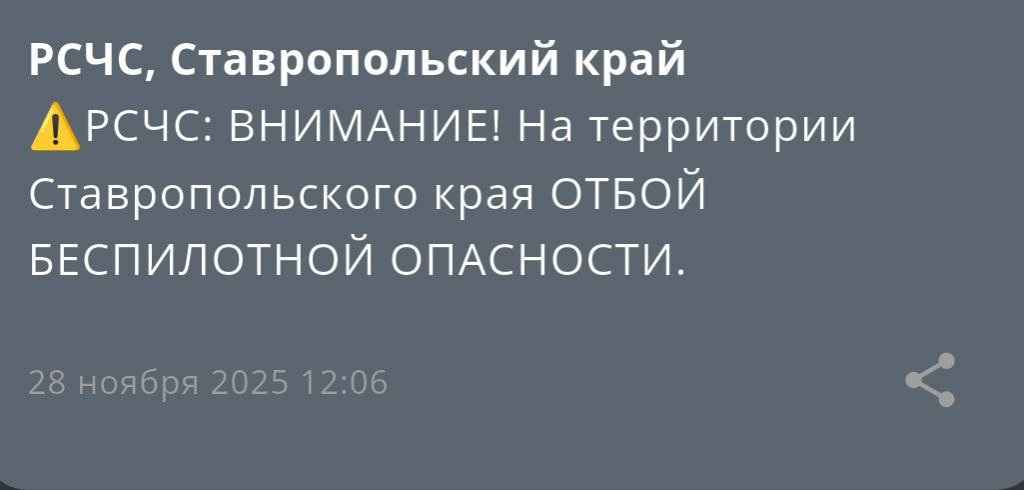 - Утро 28 ноября началось у ставропольцев с объявления опасности атаки БПЛА (28.11.2025 07:24)