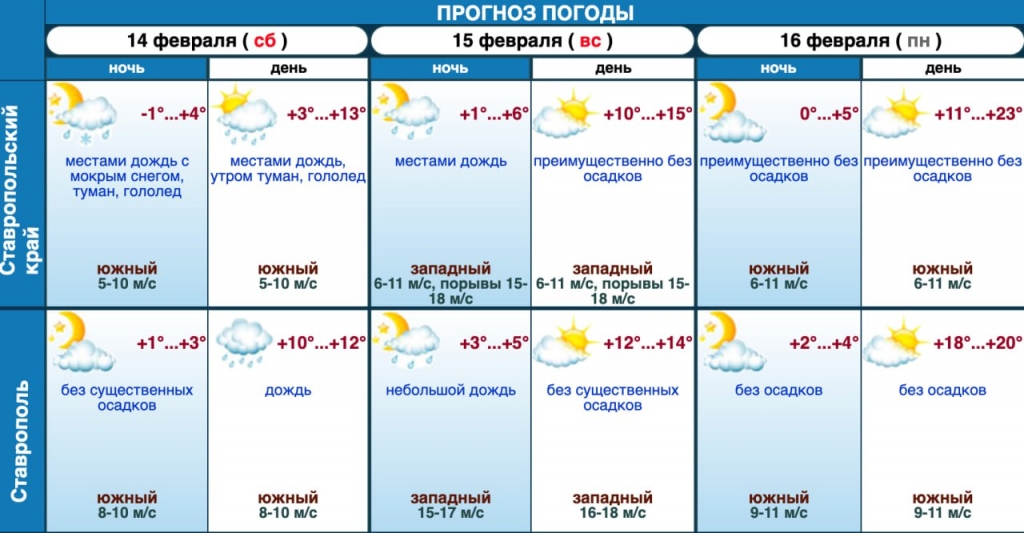В воскресенье, 15 февраля, ночью ожидается от +1 до +6 градусов. Местами пройдут дожди, а порывы ветра достигнут 18 метров в секунду. Днем преимущественно без осадков, даже иногда из-за облаков будет выглядывать солнце. Столбики термометров покажут от +12 до +15 градусов. В Ставрополе ситуация не сильно отличается. В темное время суток — от +3 до +5, а к обеду потеплеет до +14 градусов.