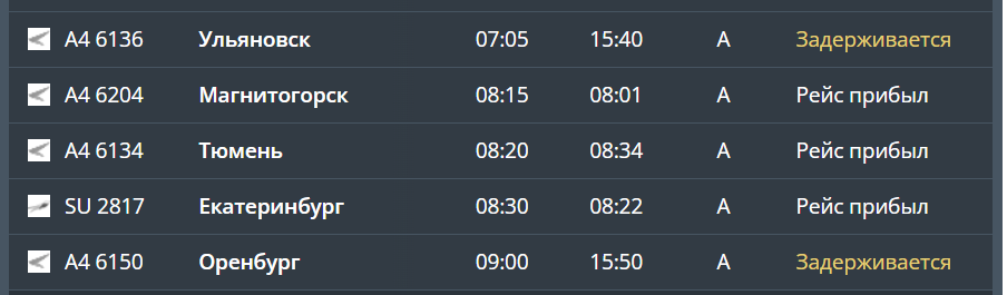 А на прилет проблемы возникли с авиалайнерами из Ульяновска, Оренбурга, Москвы, Екатеринбурга и Уфы.