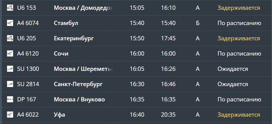 Скриншот с с онлайн-табло аэропорта Минеральных Вод