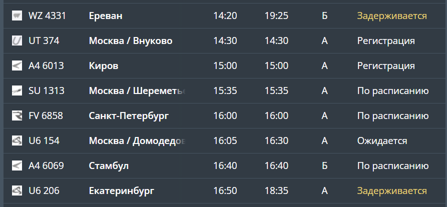 Всего 7 бортов сейчас отстают от расписания. Не успели улететь с КМВ самолеты, следующие в Ереван и Екатеринбург.