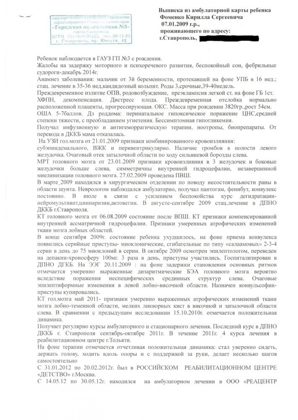 - В семье работает только старший сын Иван, имеет непостоянный доход. Средний сын Сергей студент, муж с нами не живет, а я осуществляю уход за ребенком инвалидом, - пишет мама Светлана Фоменко в своем обращении. - Данный метод лечения уже использовался нами, имеем от него положительные результаты, но необходимо пройти длительное курсовое лечение, а денег на него нет.