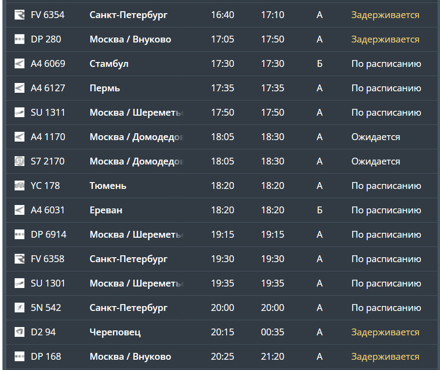 С прилетами все еще сложнее. Тут ждать прибытие самолета приходится встречающим аж 8 рейсов: из Тюмени, Череповца, Москвы, Уфы и Петрозаводска.