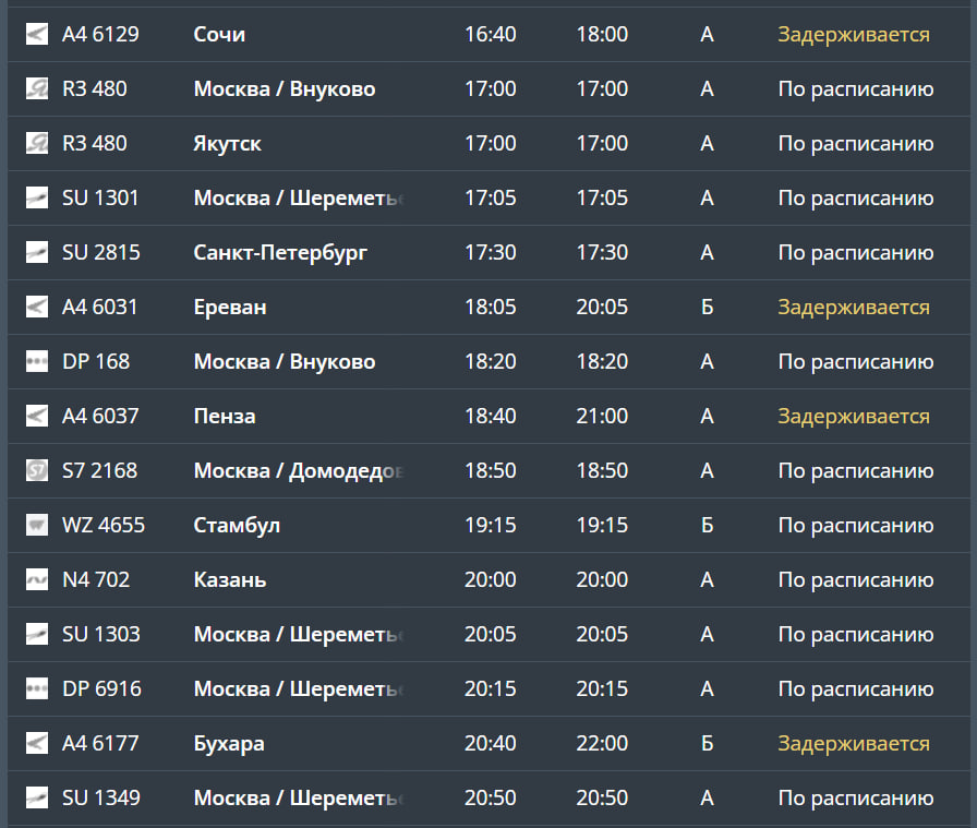 А вот с прилетами сложнее. Позже запланированного прибудут авиалайнеры из Екатеринбурга, Тбилиси, Самарканда, Уфы, Сочи и Еревана.