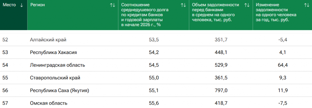 Согласно данным РИА Новости, в среднем один житель Ставропольского края должен банку около 361,5 тысячи рублей. А соотношение среднедушевого долга по кредитам и годовой зарплаты в начале 2026 года составило 55%. Рост задолженности на одного человека за год — 9,3 тысячи рублей.