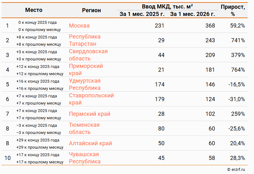 В числе лидеров также оказались Республика Татарстан с показателем 243 тысячи квадратных метров и Свердловская область, где в эксплуатацию ввели 209 тысяч квадратных метров. Ну а 26 регион и тут оказался одним из худших по критерию «прирост», потому что он составил -31%.