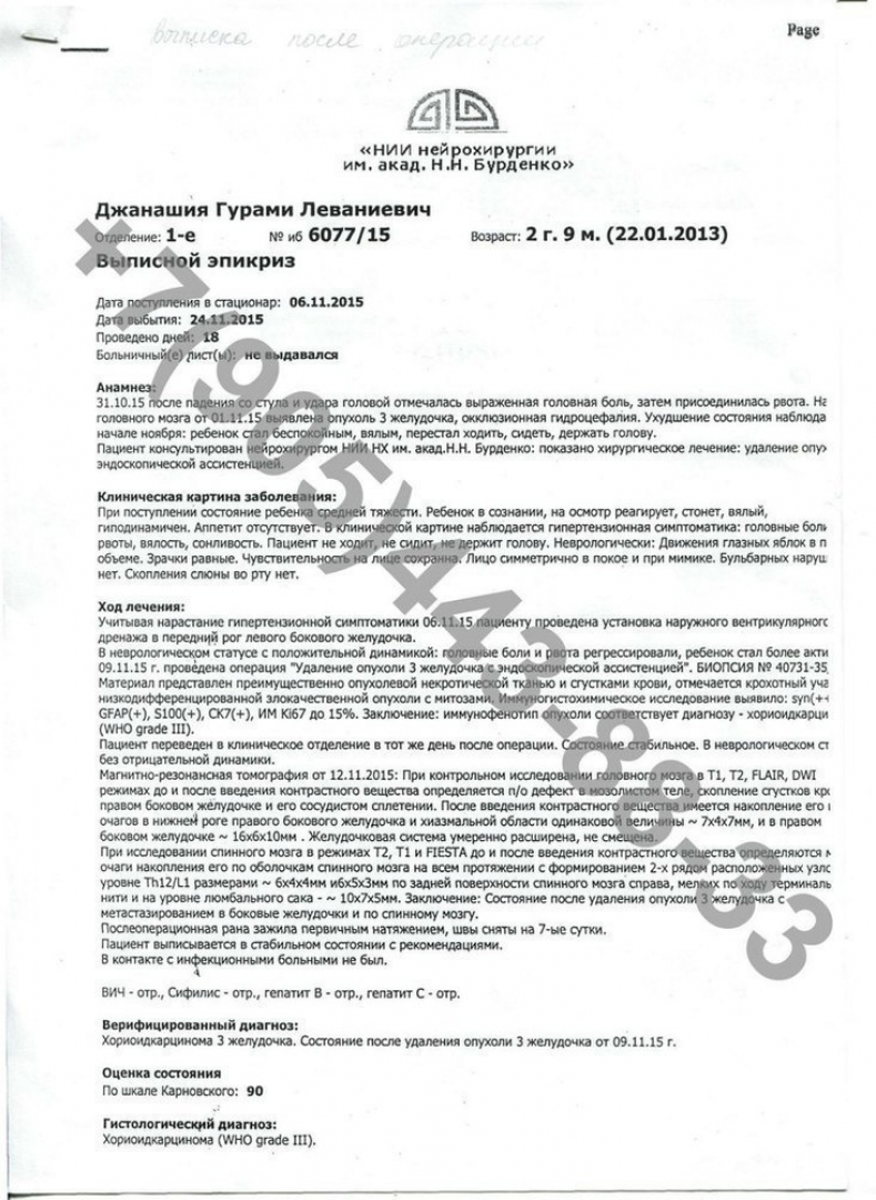 Диагноз потряс родителей: рак головного мозга с метастазами в боковые желудочки и спинной мозг. Ребенку уже сделали две операции и семь блоков химиотерапии. Однако врачи НИИ им. Бурденко заключили, что ребенку нужна протонная терапия, которой нет России. Швейцарская клиника выставила счет за лечение 137 000 швед. Франков (около 10 млн. рублей).