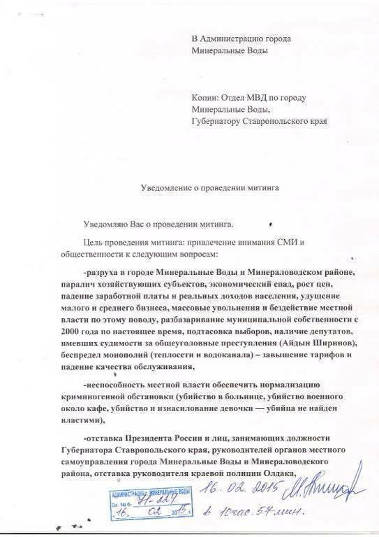 Напоминаем, несколько дней назад те же активисты уже подавали заявку на проведение подобного митинга, но он не был одобрен администрацией МинВод. Причиной отказа послужило то, что заявка была подана раньше установленного срока.