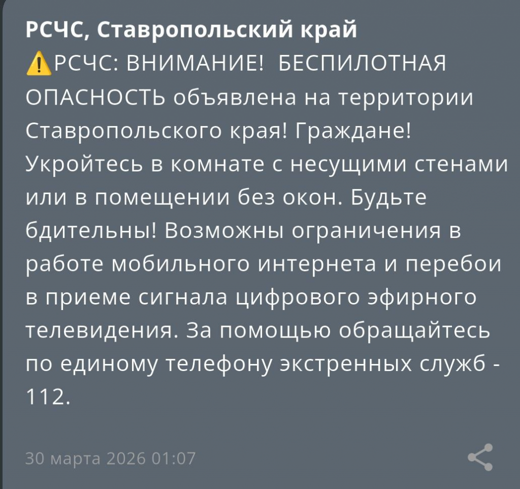 В ночь с 29 на 30 марта на телефоны ставропольцев вновь пришли уведомления о беспилотной опасности. Этими данными поделились в РСЧС в 1:07.