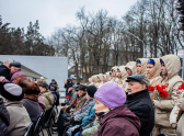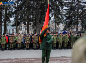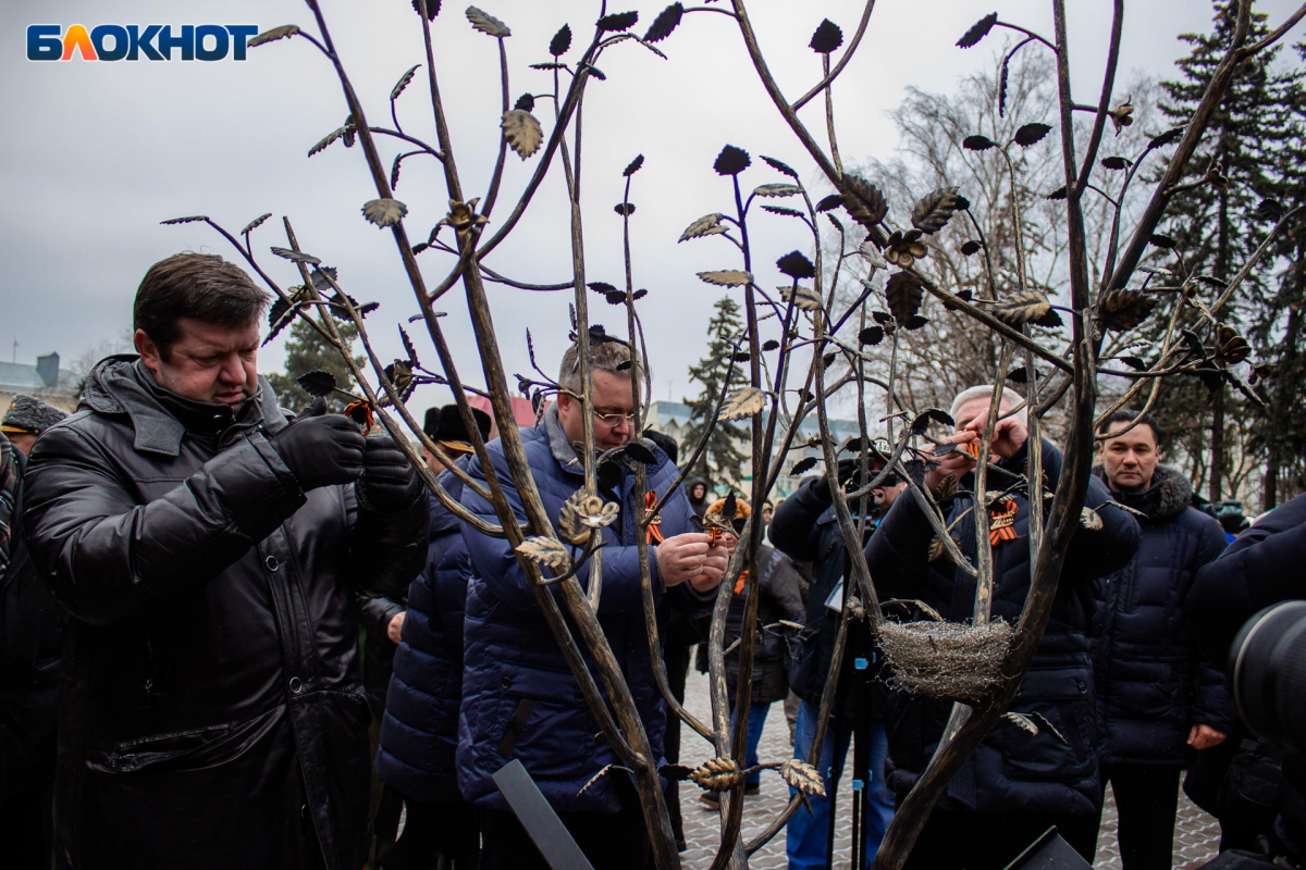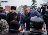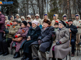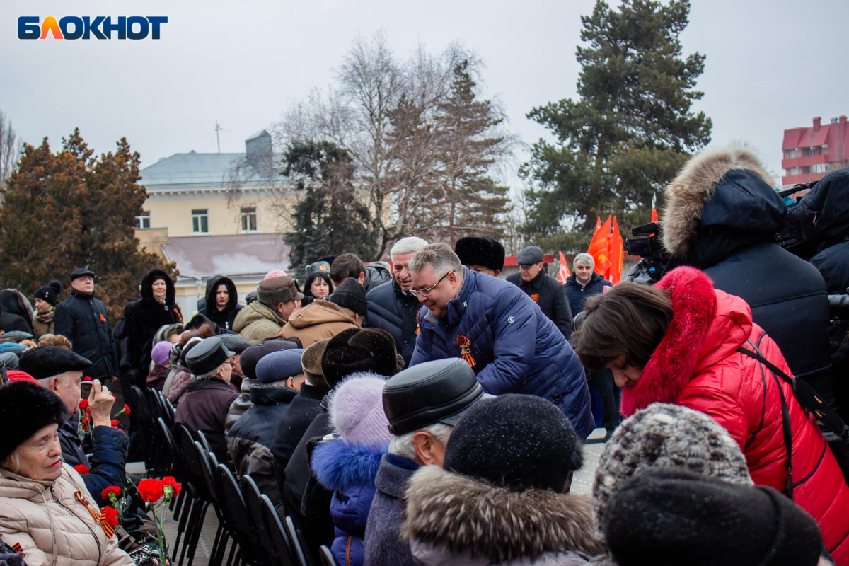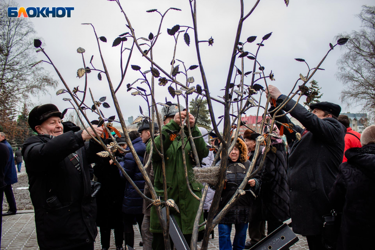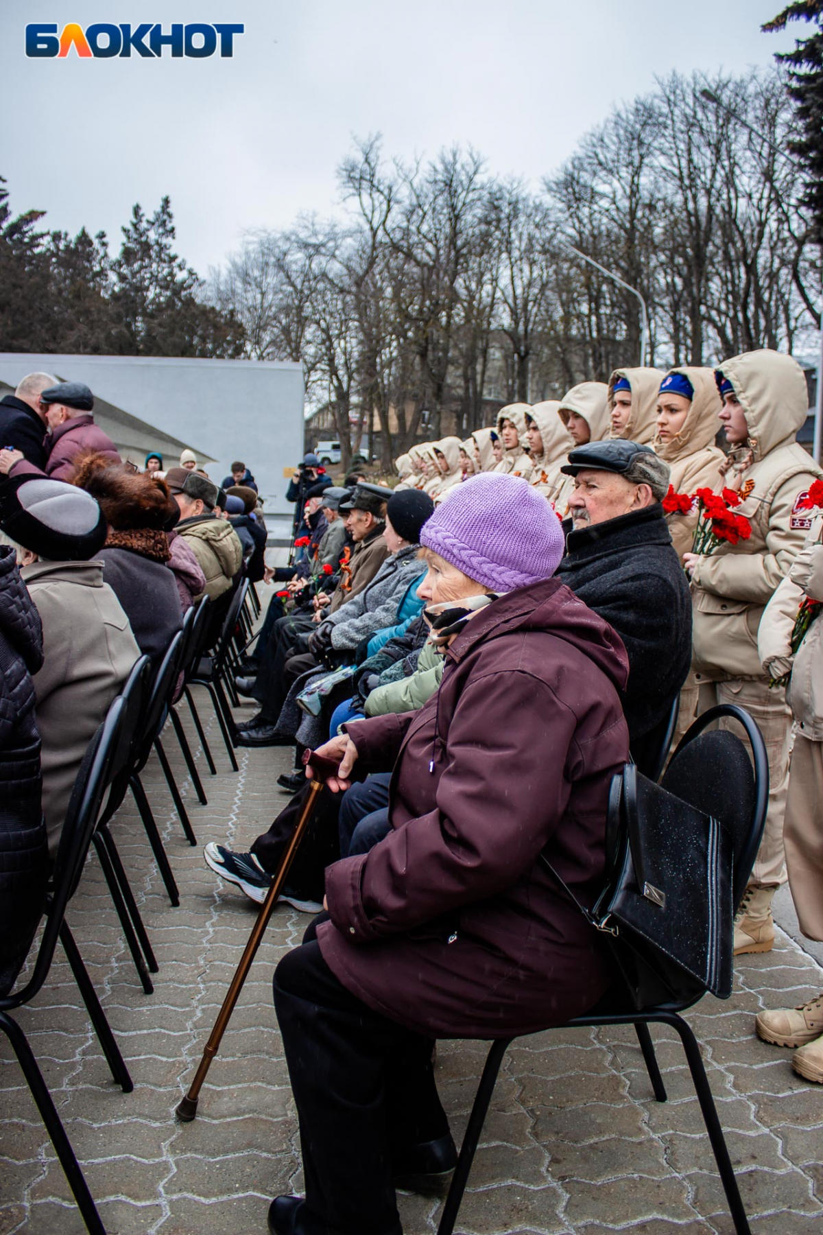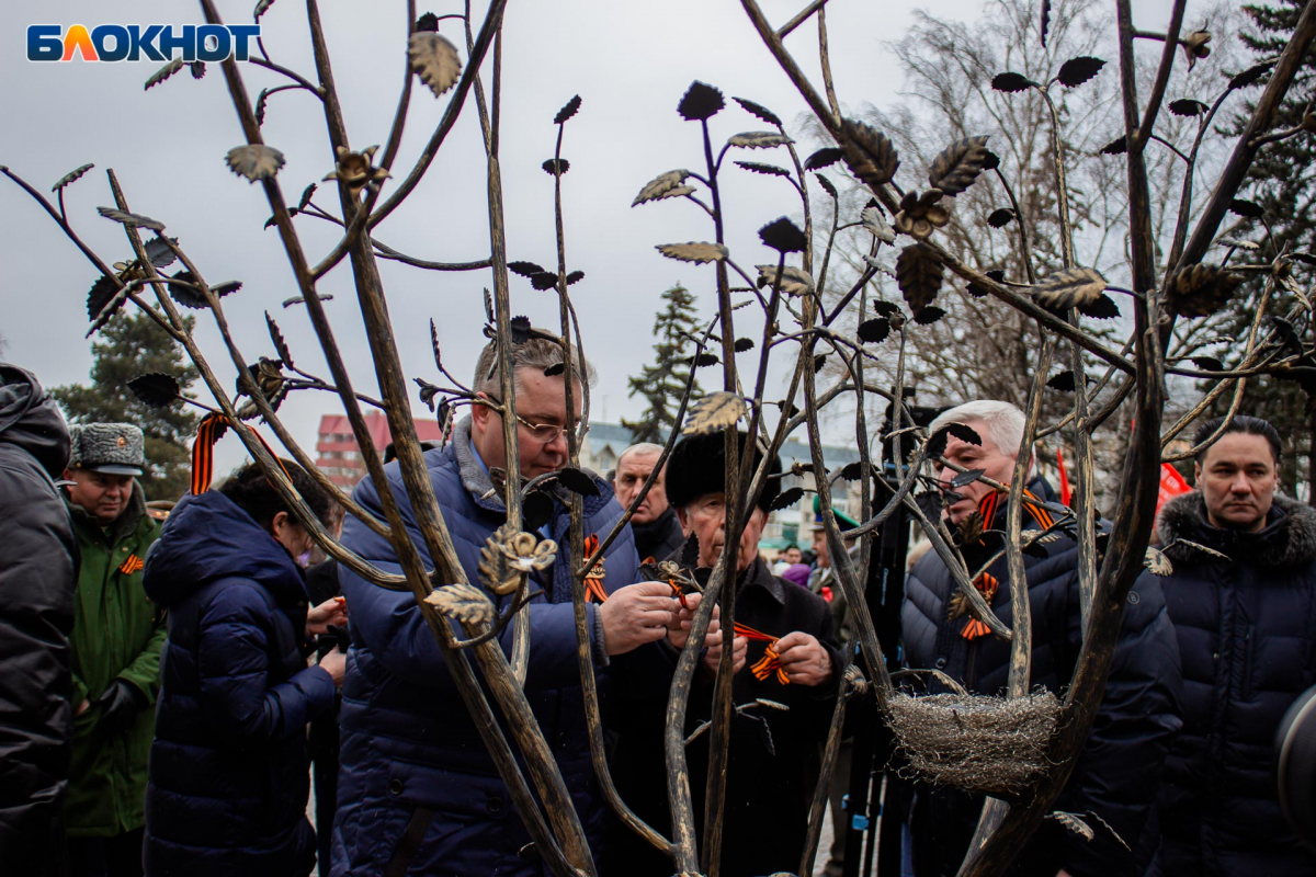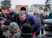 Возле памятника царило торжественное настроение. Волонтеры раздавали желающим георгиевские ленточки. Среди присутствующих — представители власти и ветеранских организаций, а также школьники и горожане.